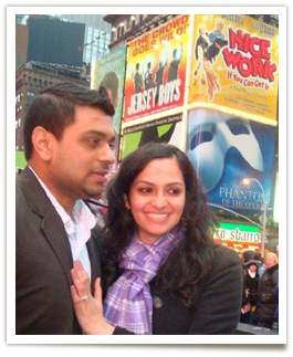 ![]() The entire evening I was just glad my mom was surprised and that dinner was delicious! I had no idea that during the same evening Rahul had already showed the ring to my parents, Harsh, and my close friends. Saturday February 11th, 2012 My friends and I had made plans to have a lunch together the next day (another plot since this was just an excuse to get me to times square for the proposal) however it had started snowing that morning and I was really exhausted from the working the whole week and planning mom’s surprise birthday dinner. I didn’t want to have lunch…I just wanted to stay inside and be warm! However true friends aren’t just for show…first Nikita called saying she is really looking forward to lunch since she needed a break from her projects! Then Priya and Mala said that they have some friends they need to meet up in the city after lunch. So lunch plans couldn’t be canceled. I had no choice but to agree…but I was going to stay in my comfortable clothing and sneakers with my hair in a ponytail! All of the sudden everyone had an opinion on what I was wearing and kept insisting I had to change and look “more presentable”…I was getting scolded from everyone…it was strange! I agreed to change and I'm very glad I did, otherwise I would have looked like I just woke up on the biggest days of my life. As we go to lunch everyone was either texting or speaking on the phone… and I thought “what was the point of coming to lunch and more importantly making me change if everyone is so busy.” After lunch we walked around and to Times Square in the cold and again I kept thinking “if we were going to do all this walking what was wrong with my sneakers”! We get to Times Square and Nikita points out an Indian girl doing a dance performance…I looked and then looked away… she pointed it again and I told her “what’s the big deal we live in NYC people do dance performance on the streets all the time” then one girl became three girls and then Priya and Mala joined in. At this point I knew something was going to happen and was surprised to see that they knew the steps! My heart was beating faster and faster as more people kept joining in…people I recognized and everyone was so well coordinated. My legs were starting to lose all feeling. Then all of the sudden Rahul joined in! He was supposed to be in Chicago for a meeting! I started to slowly inch back. I could feel Darshini’s hand on my back stopping me… I knew he didn’t dance and for him to do such a gesture was unbelievable to me. I was shaking, my palms were sweating and my heart beats were out of sync. It almost felt too good to be true. I can’t fully describe what I was feeling at the time, there were so many emotions running though me. The entire experience was so surreal. I can’t believe how many people had a hand in pulling the proposal together. It took hours of preparation and months of dedication, all for one person. I never thought in my wildest dreams that I would get such a proposal. I had thought it would happen over dinner or the next time both families were together in one place. I was completely taken back by the amount of thought and detailed planning Rahul put in this and the efforts it took from everyone near and far. I guess fairytales still happen for girls like myself. Sunday February 12th, 2012 I was astonished to find out the full details of the proposal and of how many knew about it, basically everyone but me. I was stunned to hear that my mom was able to keep such a huge thing from me. She usually tells me EVERYTHING! Now that I look back, the days leading up to the proposal were peculiar to say the least; everyone was acting strange‐ I didn’t hear from my close friends as Much. Initially I thought it was due to my work schedule, but now I know they were all busy planning and preparing for the big weekend. Rahul was all over the place with the things he was telling me, like how he was going to be traveling back and forth between Chicago and NY all weekend. I thought we were only surprising my mom, but I was the one who really ended up being pleasantly surprised.! This proposal wouldn’t have been possible without… ![]()